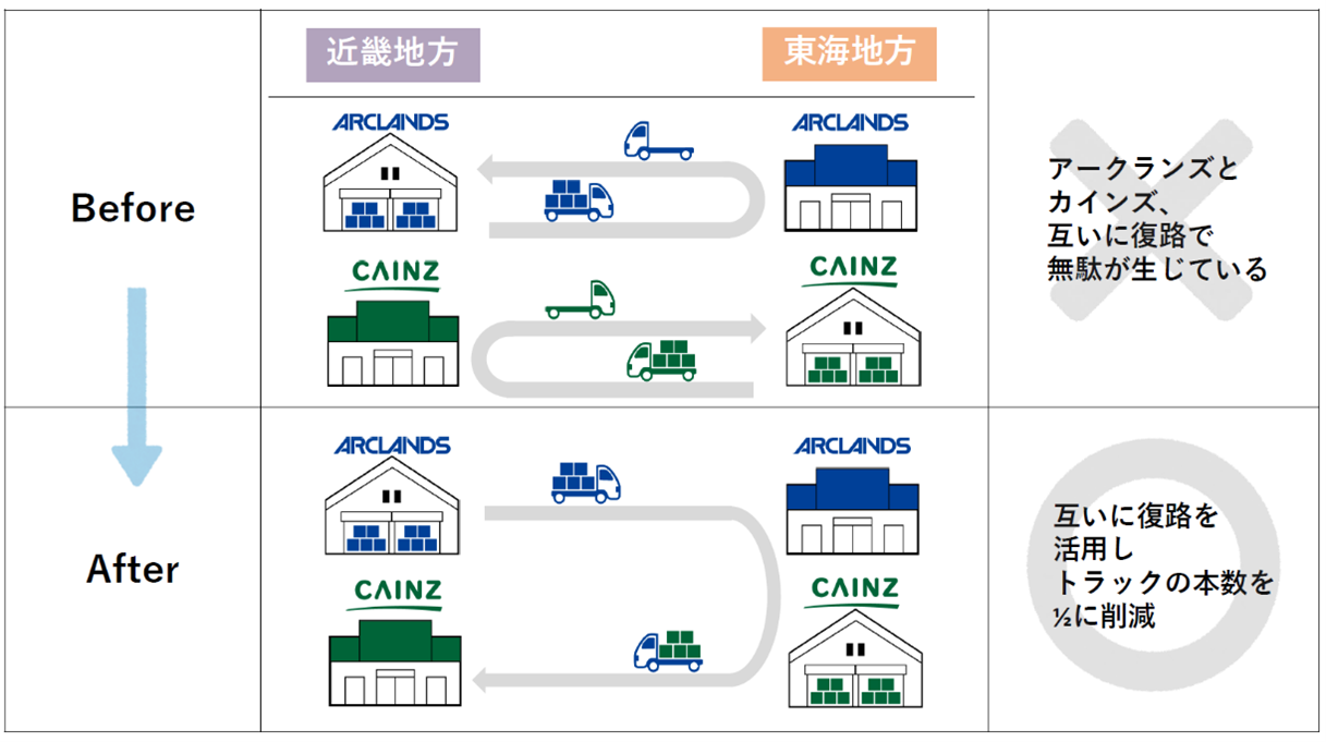 アークランズとカインズは、これまで各社の物流センターから自社店舗へ納品した後、復路は空車のまま各社の物流センターへ戻る運用としていました。今後は、各社の店舗への納品後に協業先の物流センターで荷物を積載し、協業先の店舗へ納品したうえで自社の物流センターに戻る運用へ切り替え、復路の相互活用によるムダの少ない輸送を図ります。