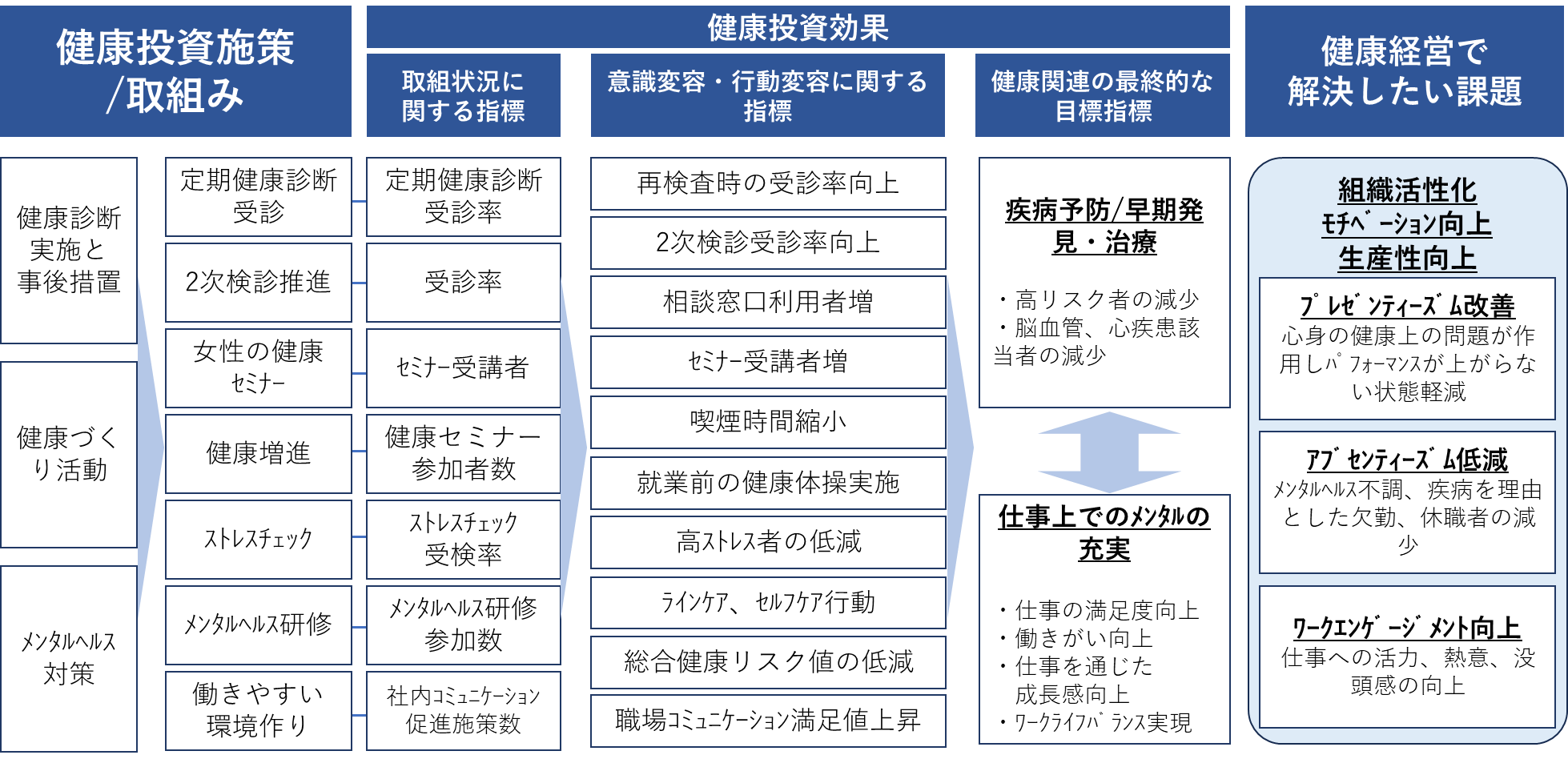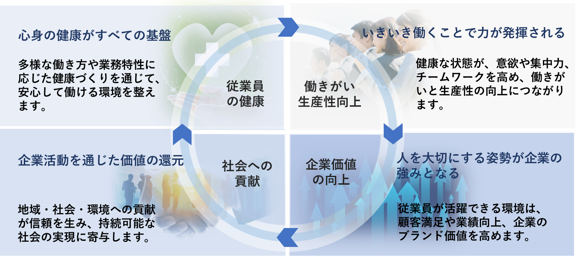 従業員の健康が働きがいや企業価値、社会への貢献へとつながり、その成果がふたたび健康を支える循環を築いていきます。