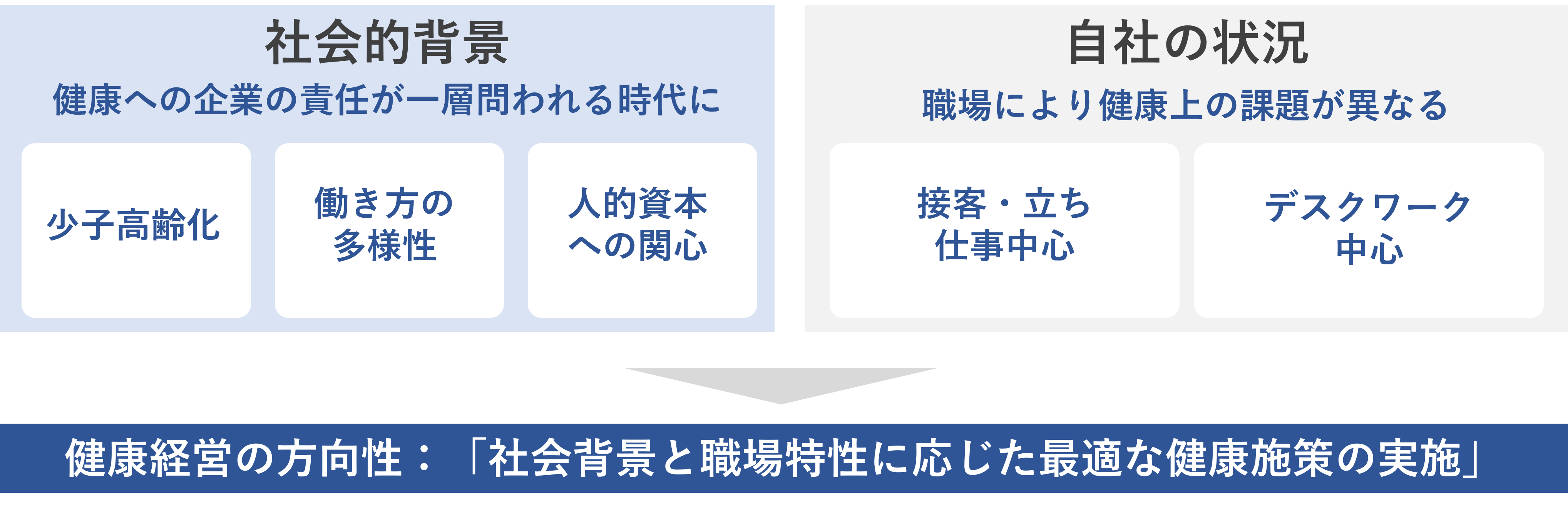 当社は小売業として、接客を中心とした「店舗勤務」とデスクワークを中心とする「本社勤務」が共存しており、職場ごとに異なる健康上の課題があると認識しています。こうした社会的背景と自社の業務特性をふまえ、私たちはすべての従業員が心身ともに健康で、安心して働ける職場づくりを目指し、職場ごとの特性に応じた健康づくりを積極的に推進してまいります。