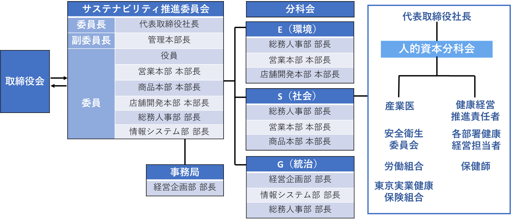 当社では、従業員の心身の健康保持・増進を企業の持続的成長の基盤と捉え、健康経営を全社的に推進しています。推進体制としてはサステナビリティ推進委員会と連携し、健康経営を持続可能な企業経営の一環として位置づけます。